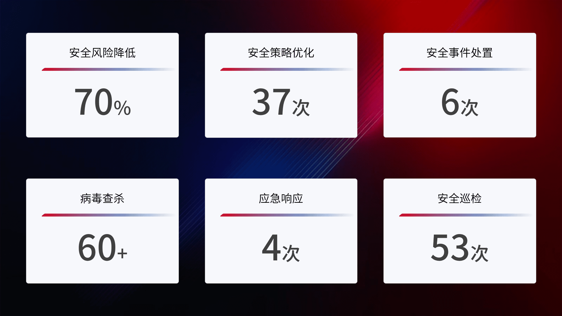 提供全面的安全事件报告体系,,,,包括处置报告、、周报、、、、季度和年度总结,,,结合持续监控,,,帮助客户深入了解网络安全状况。。
